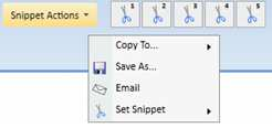 Snippet Actions, located at the top of the Attachment view pane near the tool bar, display the same features as the Snippet Menu.